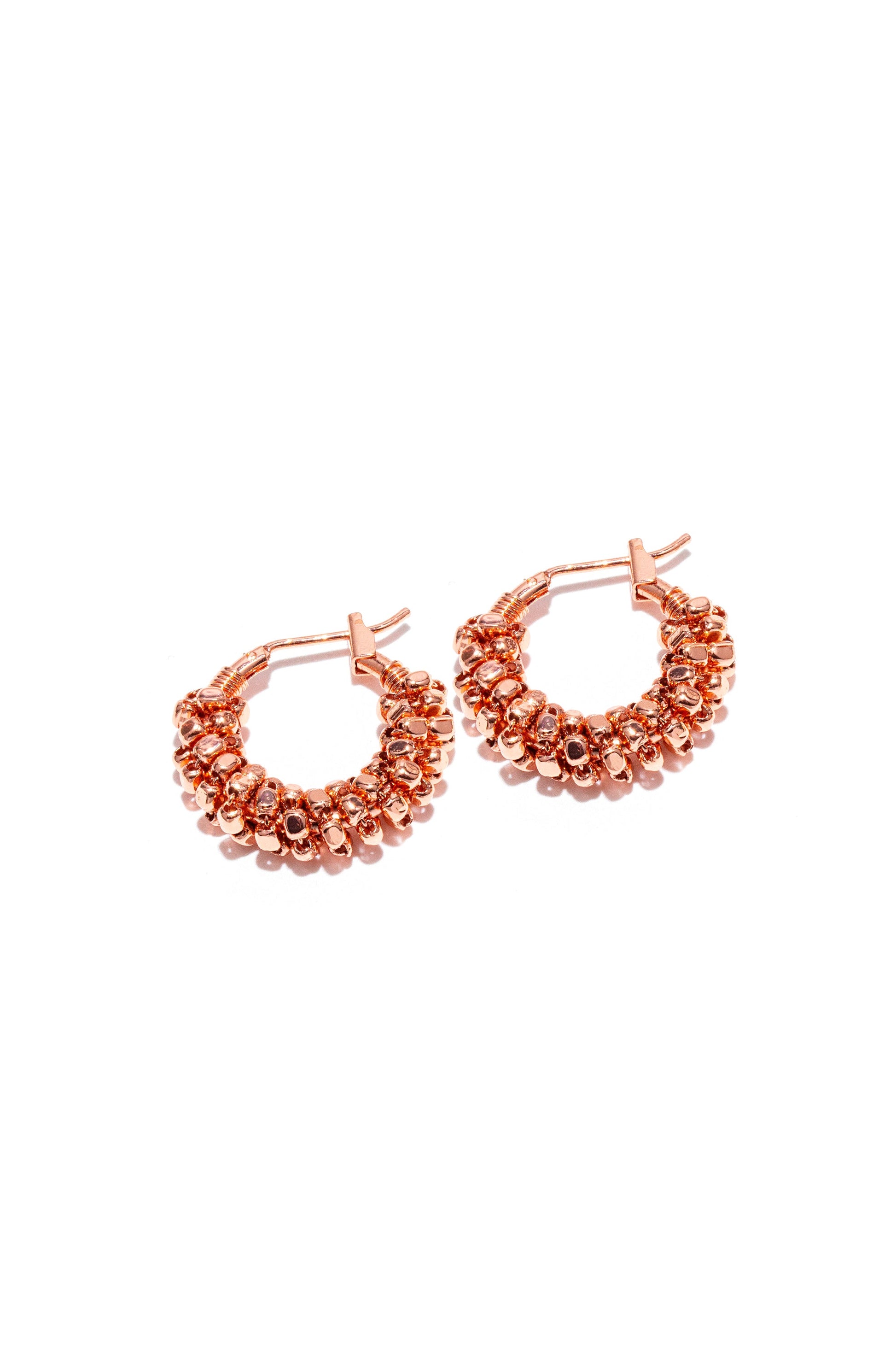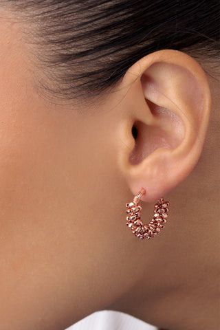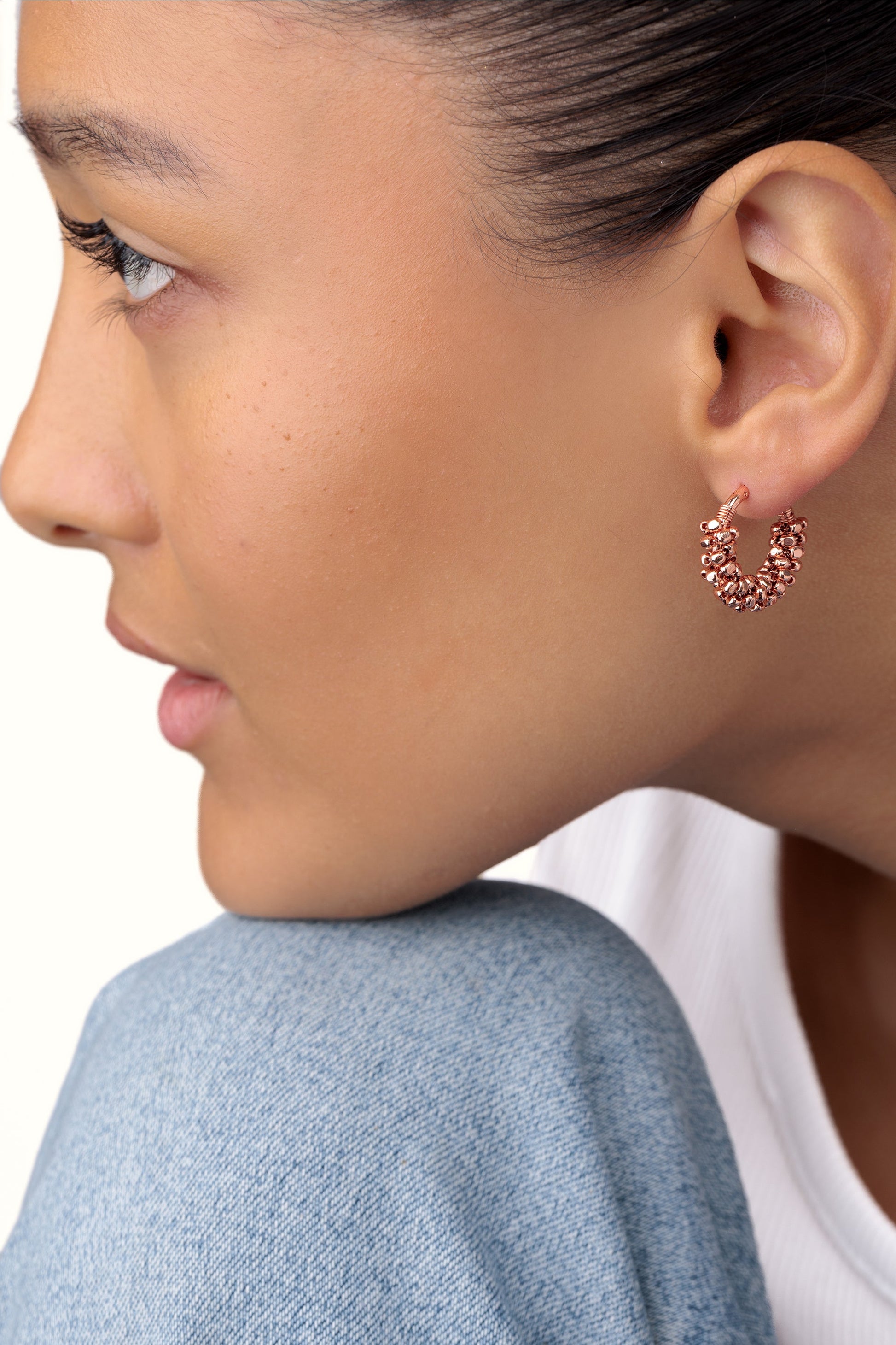 Mini hoop naušnice s rose gold premazom dolaze sa ramastim pečatima sa sjajnim završetkom, koje su kompaktne i svestrane. Ovaj šik detalj savršeno funkcioniše tokom dana, jednako dobro se uklapa u večernji izgled.