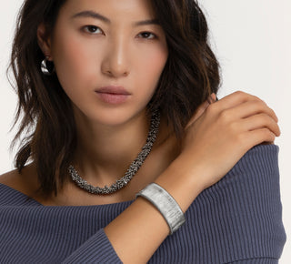 Kratka ogrlica napravljena tehnikom mogra, inspirisana indijskim tradicijama: mikro elementi su upotpunjeni u bogatom 3D uzorku koji podseća na grančicu jasmine. Mekana i sjajna, obavija dekolte sa karakterom—nosite je samostalno kao statement komad ili se postavlja sa minimalističkim lancima za savremeni izgled.