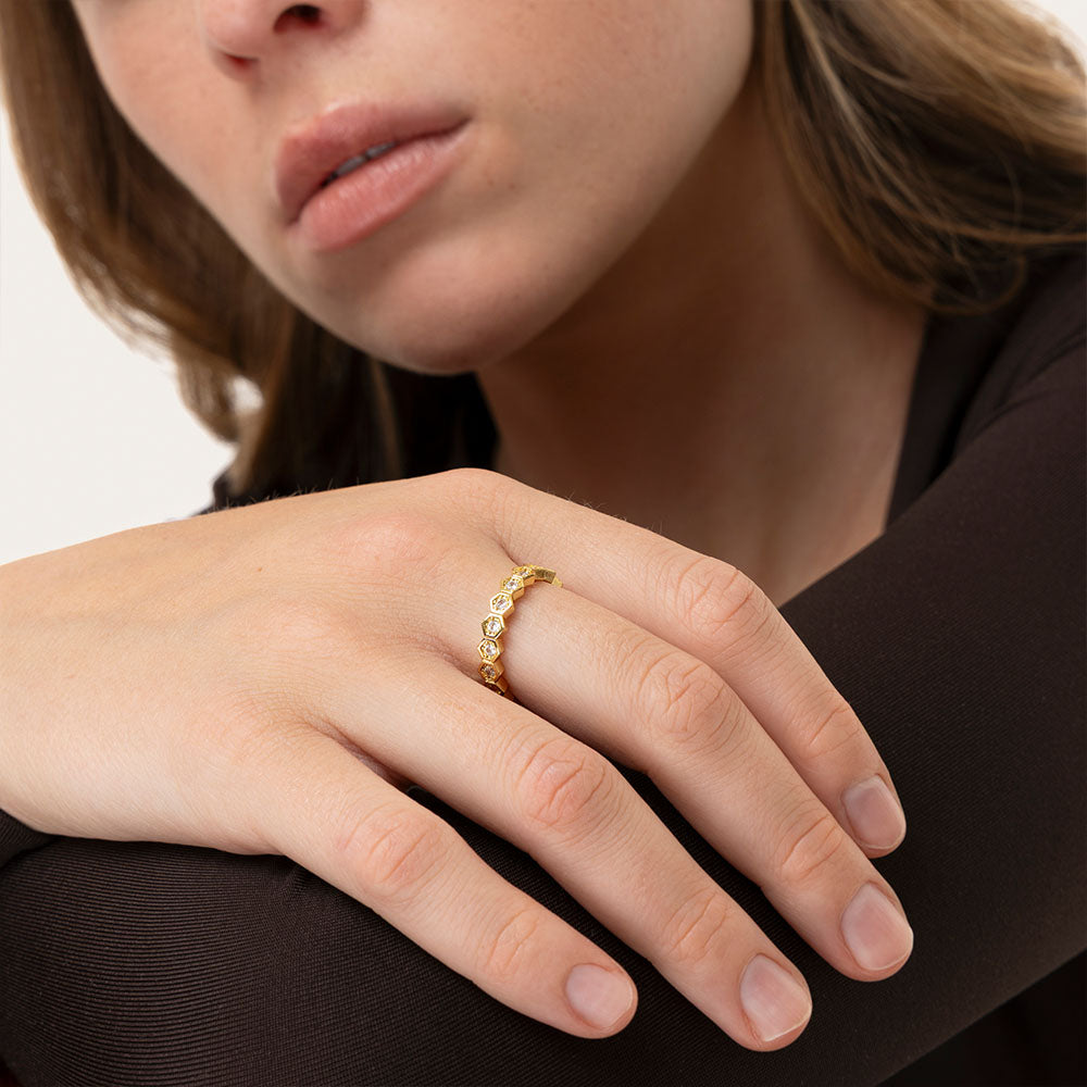 Za ljubitelje klasike: očarajte se ovim prstenom sa nizom sjajnih cirkonijuma u heksagonima. Ovaj jedinstveni komad nakita je savršen za specijalne prilike, bilo da se radi o ceremoniji ili kao poklon za one koji voli sofisticirane detalje.